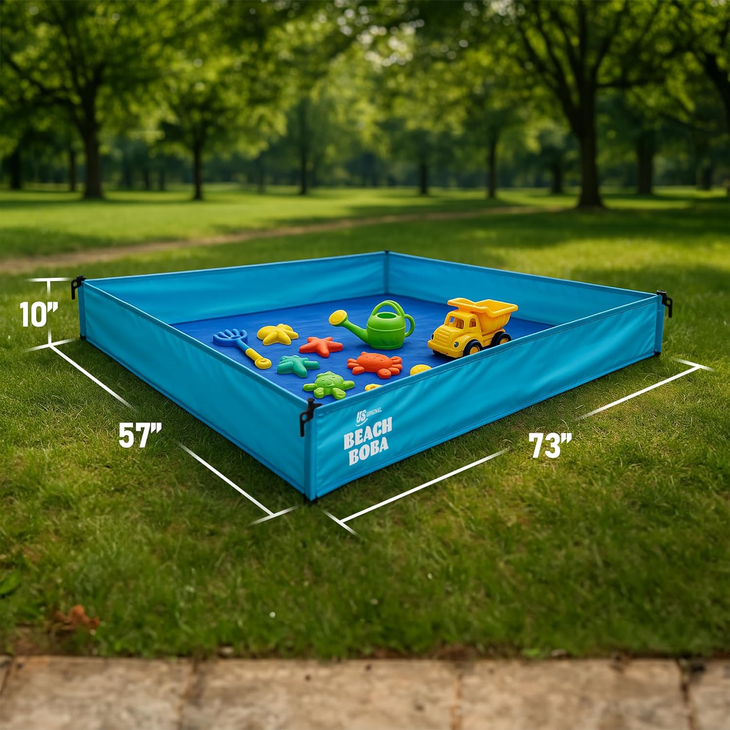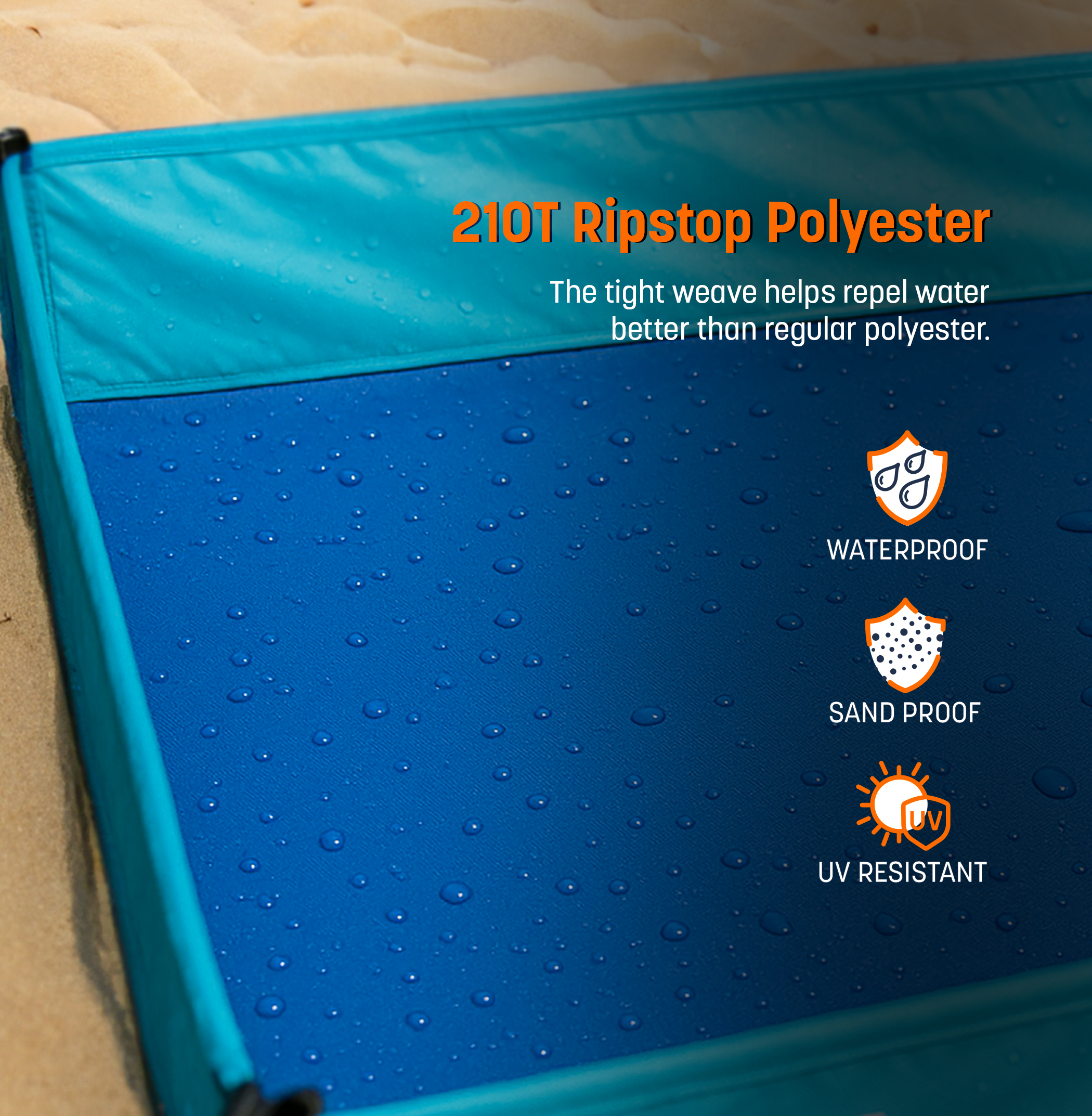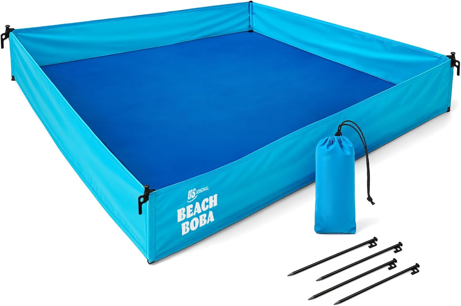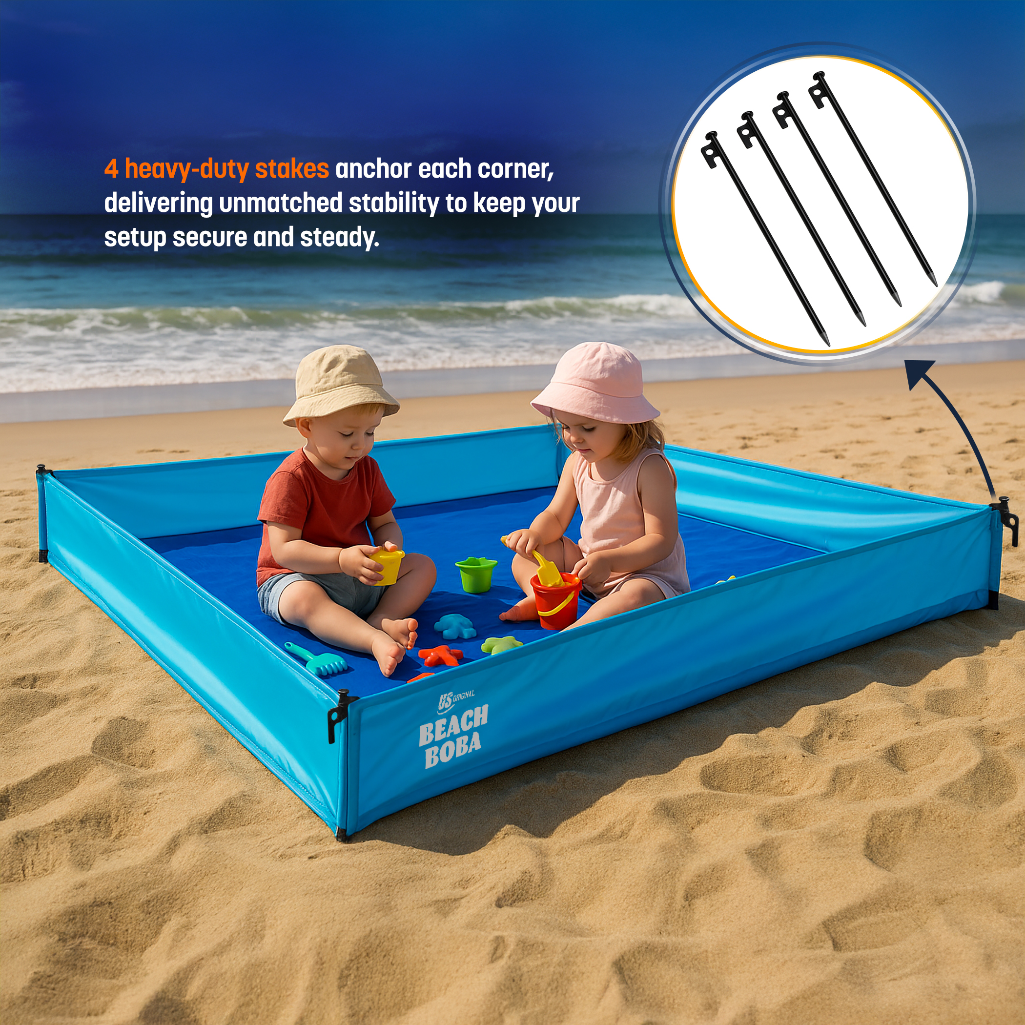 The BeachBoba Play Zone creates a sand-free haven for your little beach explorers. This spacious 6ft x 5ft play area features 10-inch side walls that keep sand at bay, thanks to secure corner stakes (included). Made with premium, sandproof and waterproof 210T Ripstop Polyester, the BeachBoba Play Zone handles spills and messes with ease. Simply shake off residual sand, or toss it in the washing machine for a deeper clean. Four heavy-duty metal stakes anchor the corners for ultimate stability, ensuring your fun zone stays put no matter what. For even windier days, optional plastic stakes secure all four sides. When the beach day is done, a convenient drawstring storage bag makes packing up a breeze!