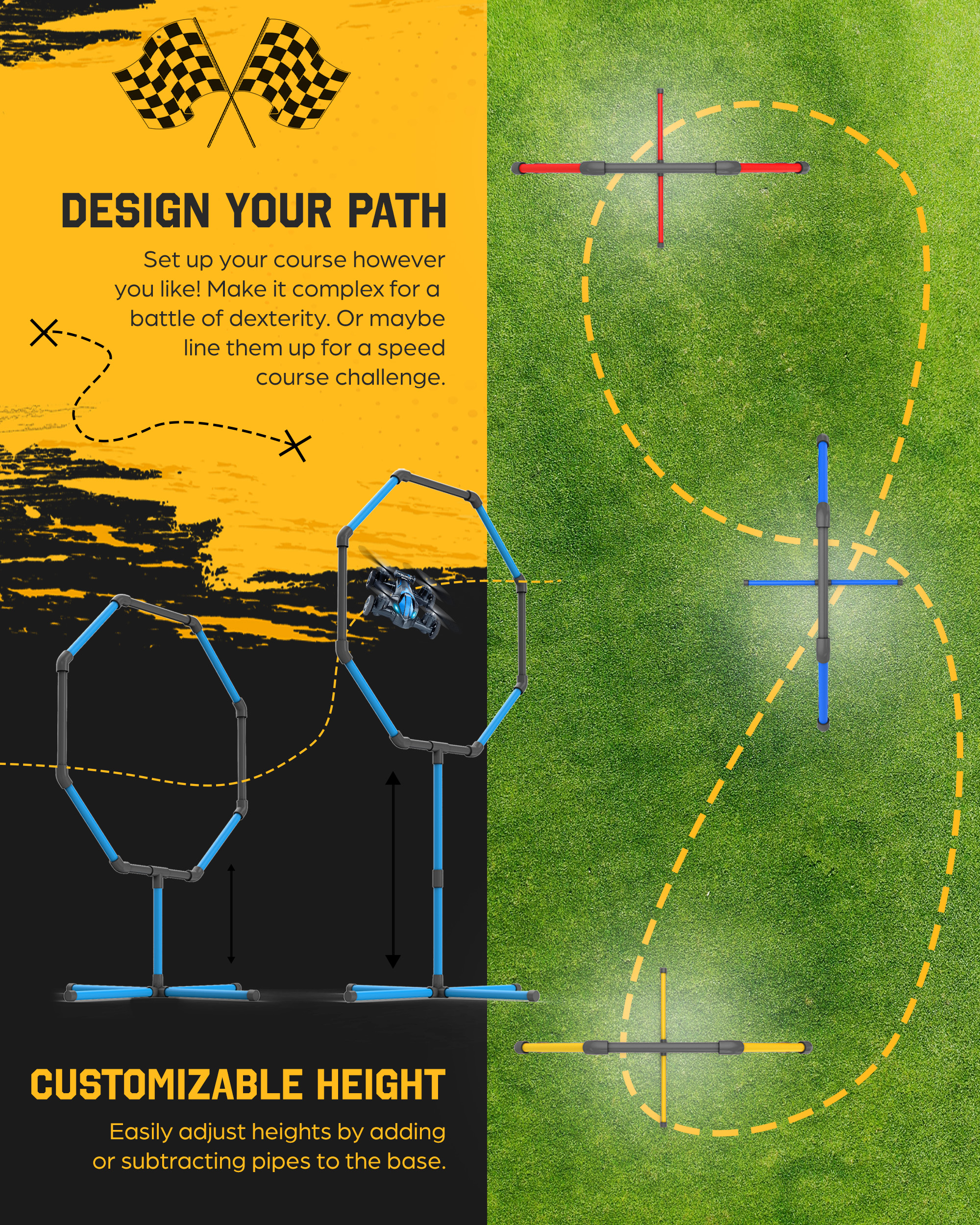 This obstacle course set is suitable for beginners, and can be made more challenging by adjusting the 3-loop racing course configuration. Checkpoint diameters: 20 inch / 23 inch / 27 inch