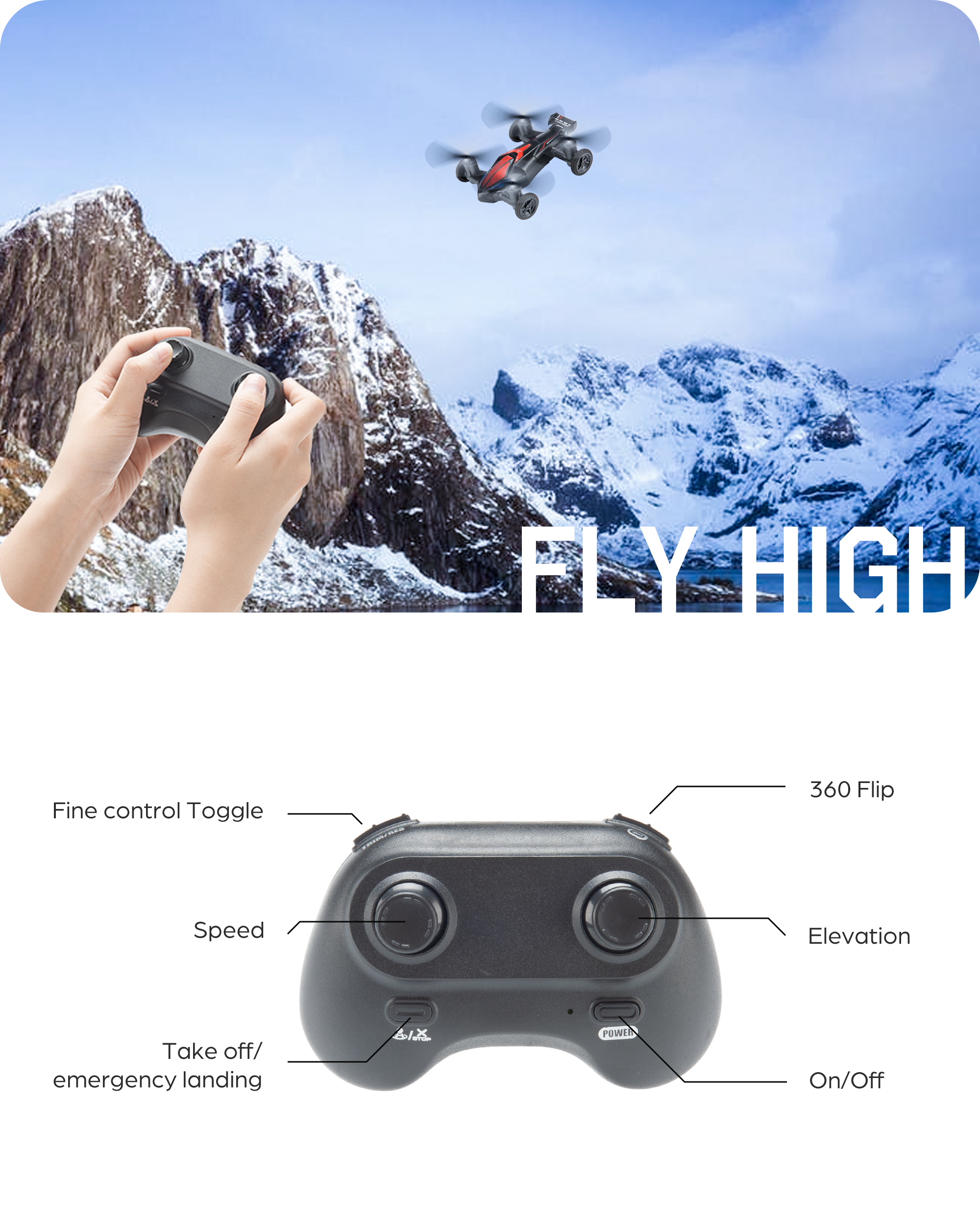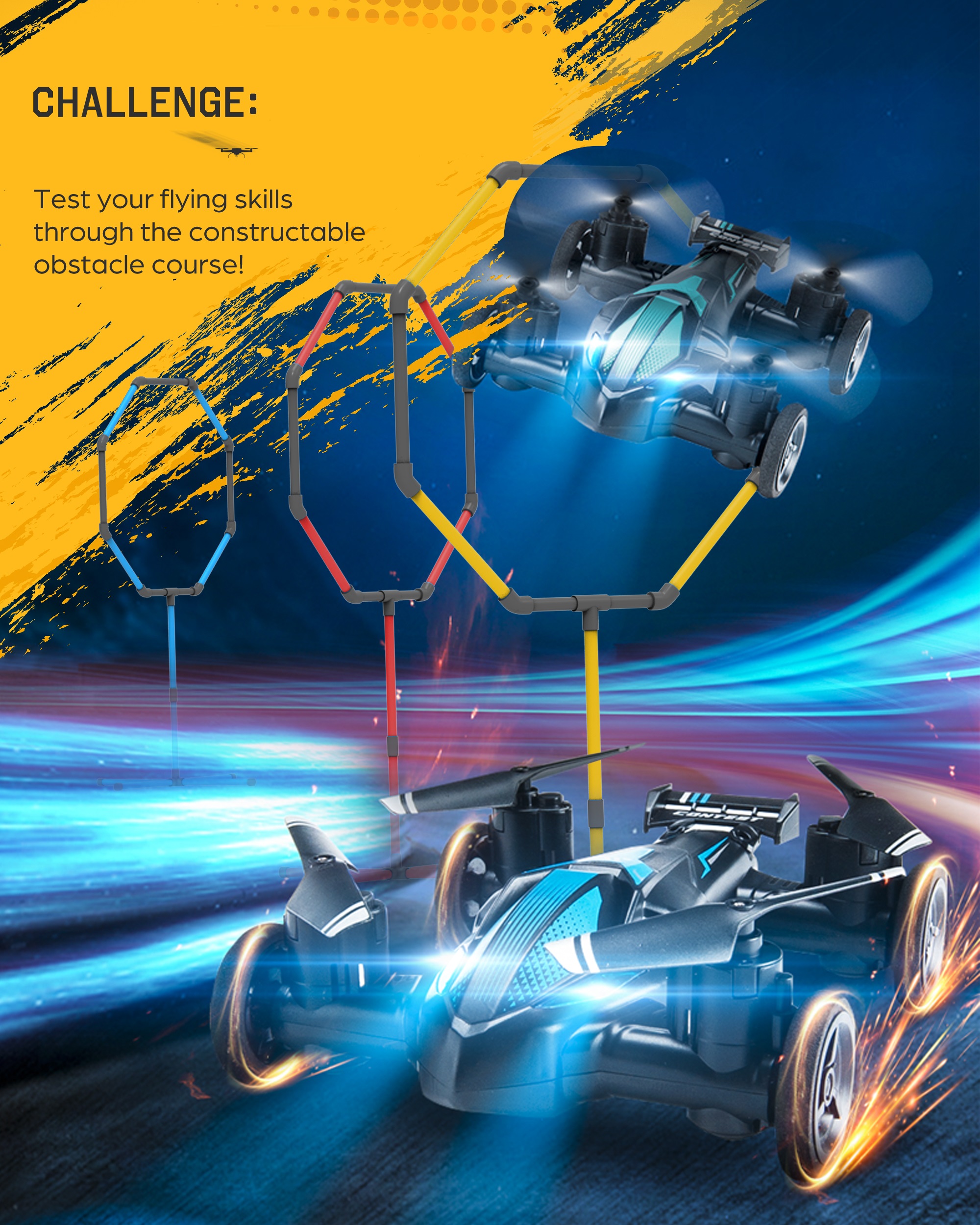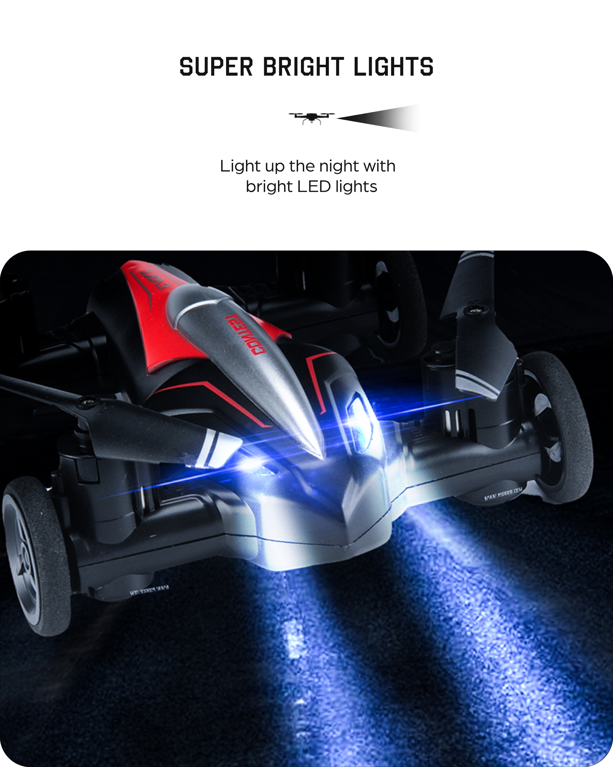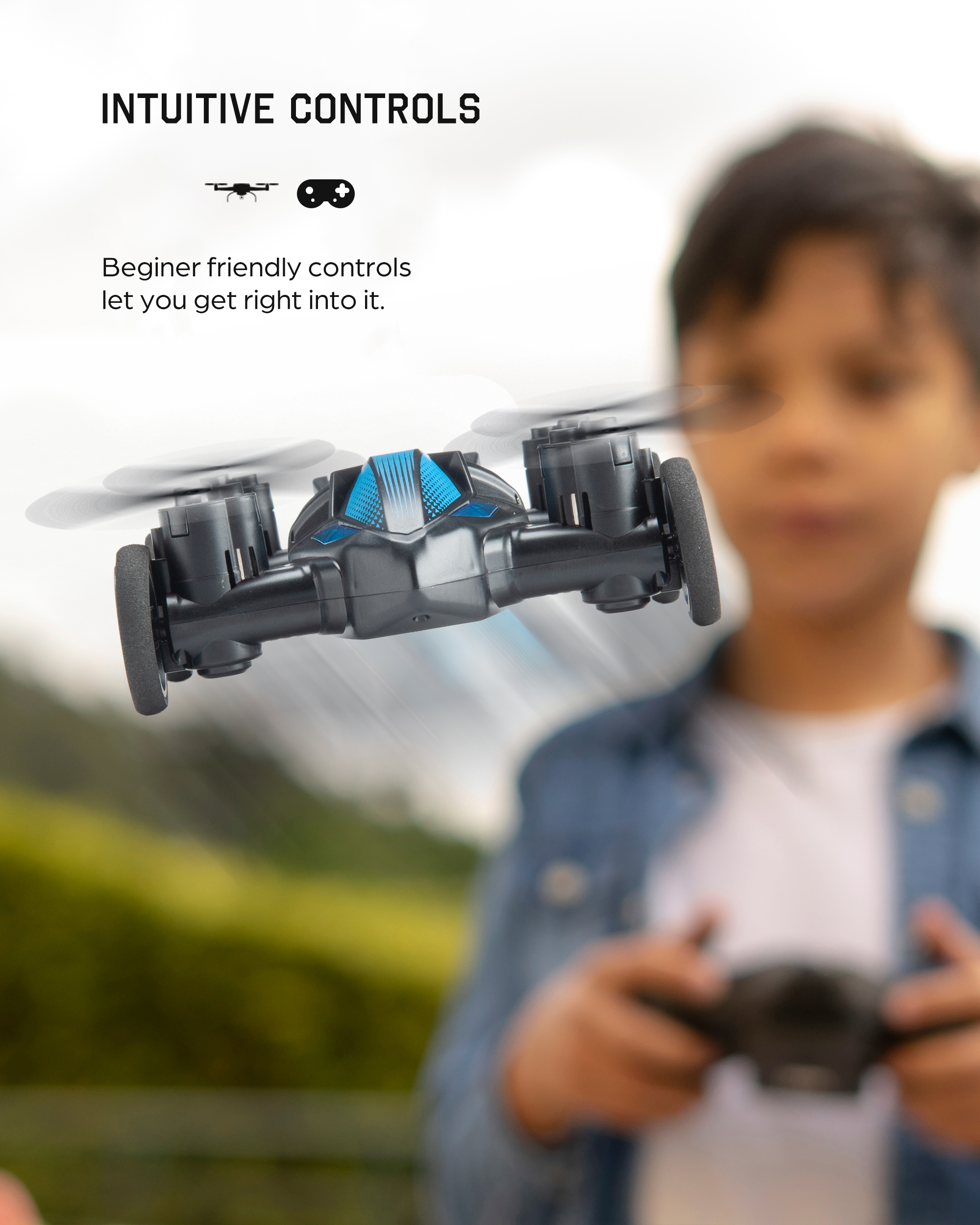 Flip between Drone Mode and Car Mode at the flip of a switch for double the fun. Drone also features one click takeoff and landing, high and low speed control, and intelligent height setting.