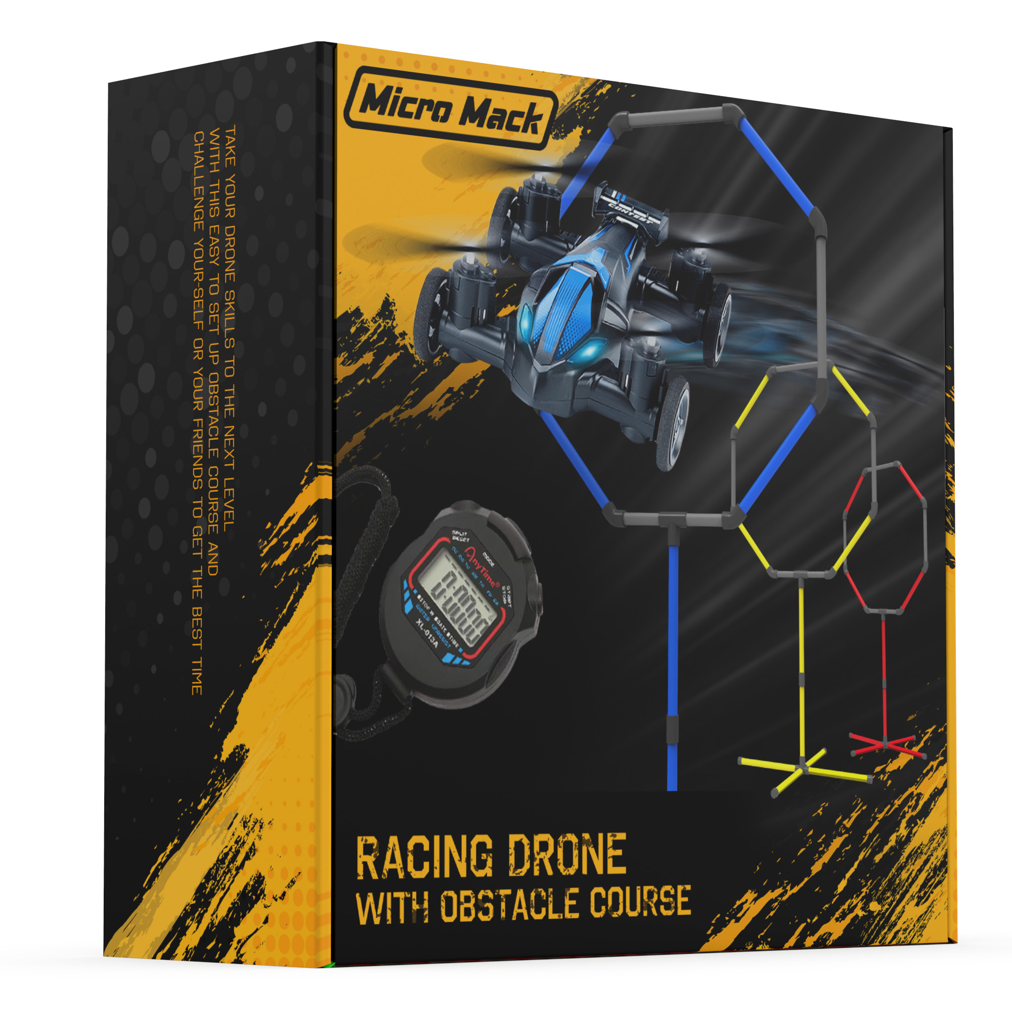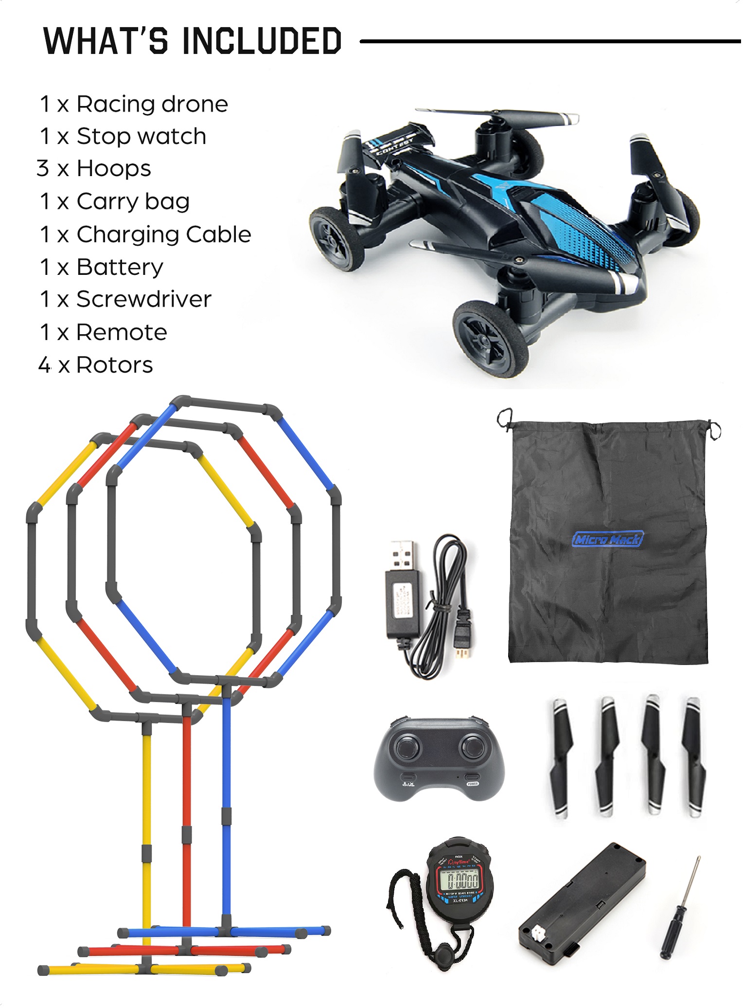 Makes a great gift for older kids and teens! Set includes: Racing drone, extra propellers, USB charging cable, remote control (uses 3 AAA batteries), 3 individual pass-through obstacle checkpoints, stopwatch, and storage bag.